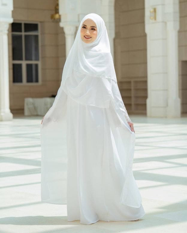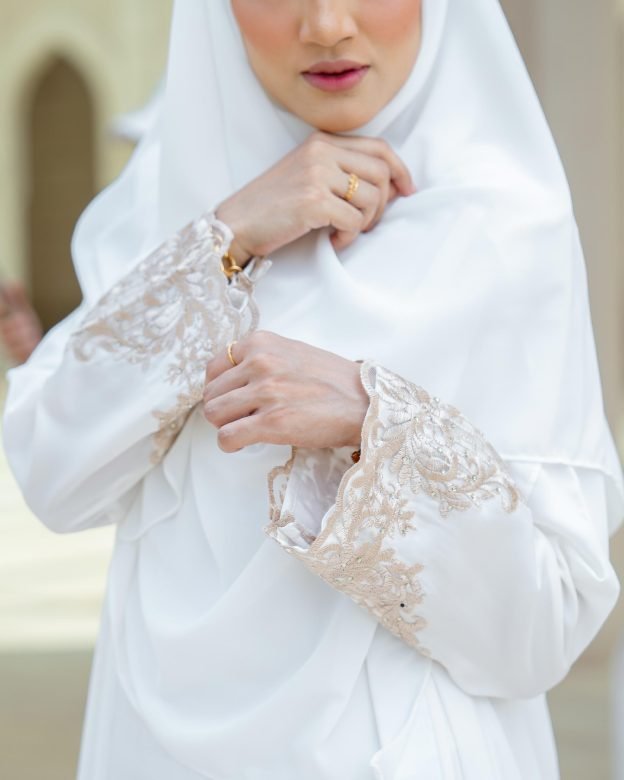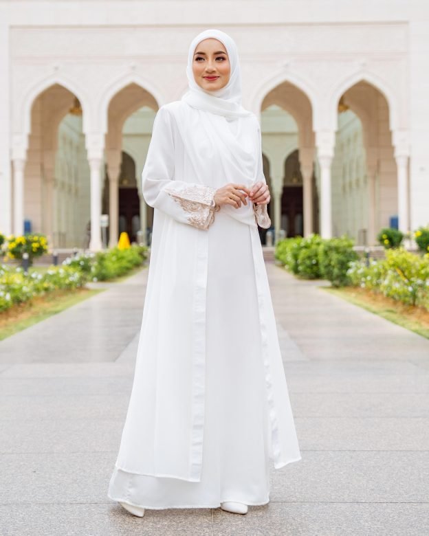 The Abaya Cardi Lace Rizka in Off White features a light, neutral tone with lace detailing, ideal for daytime events or casual outings. Its design ensures comfort and style.