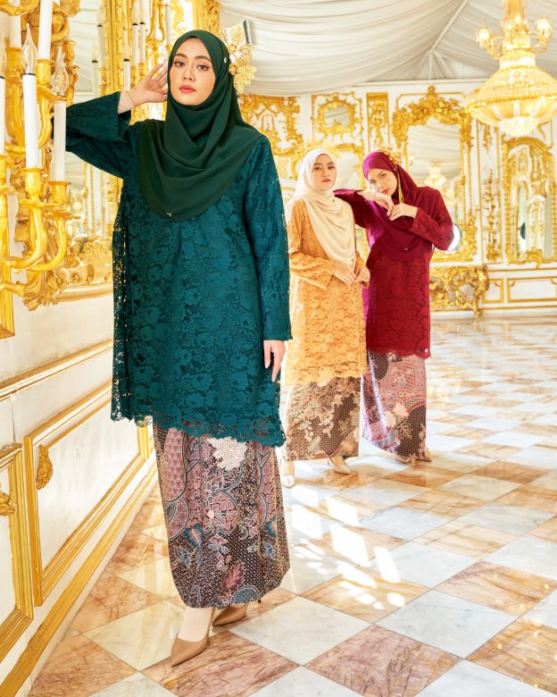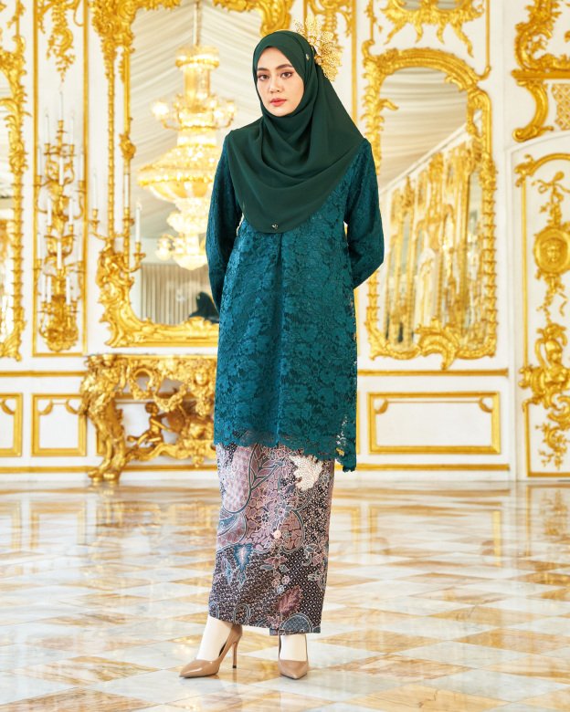 Tradition meets artistry in the Baju Kurung Lace Batik Alexa in Zamrud Green. Featuring hand-drawn batik prints paired with lace embellishments, this ensemble is a celebration of Malaysian heritage. The emerald green tone adds richness and elegance to the look.