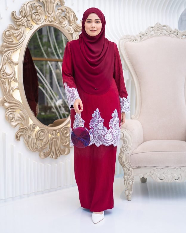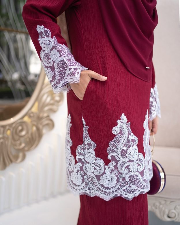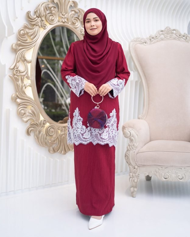 Rich and regal, the Baju Kurung Moden Lace Hayley in Maroon evokes traditional opulence. Perfect for evening wear or ceremonial events, the deep wine tone paired with delicate lace detailing enhances your poise and elegance.