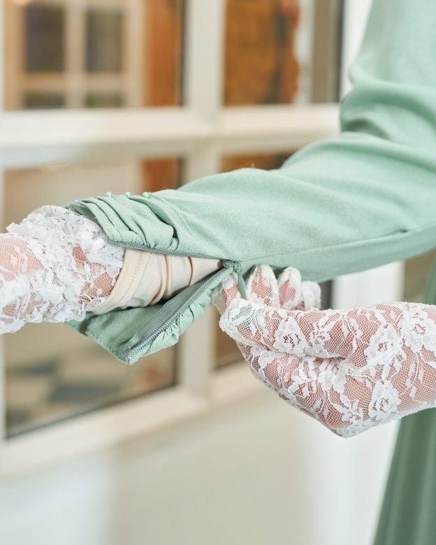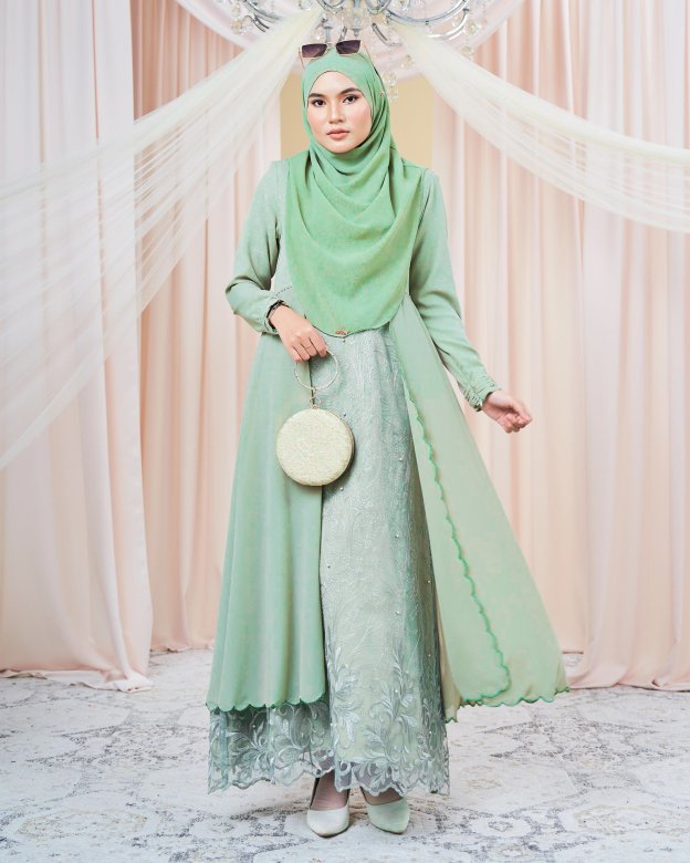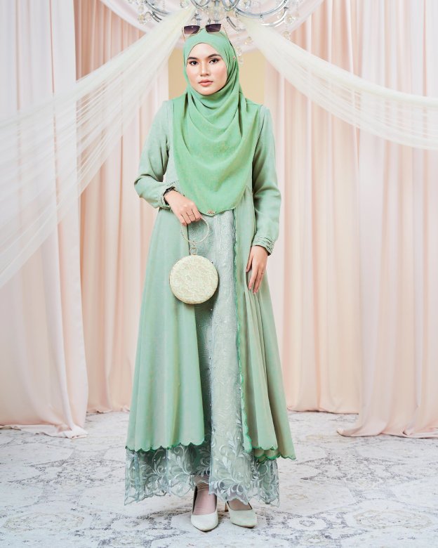 The Dress Lace Sulam Rozana in Capri Sea showcases delicate lacework and a serene blue-green tone, ideal for beachside events or summer gatherings. Its flowing design ensures ease of movement.
