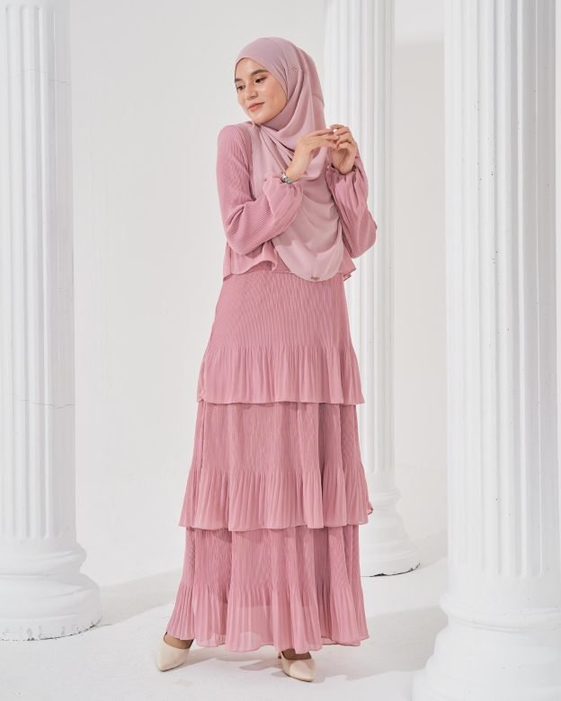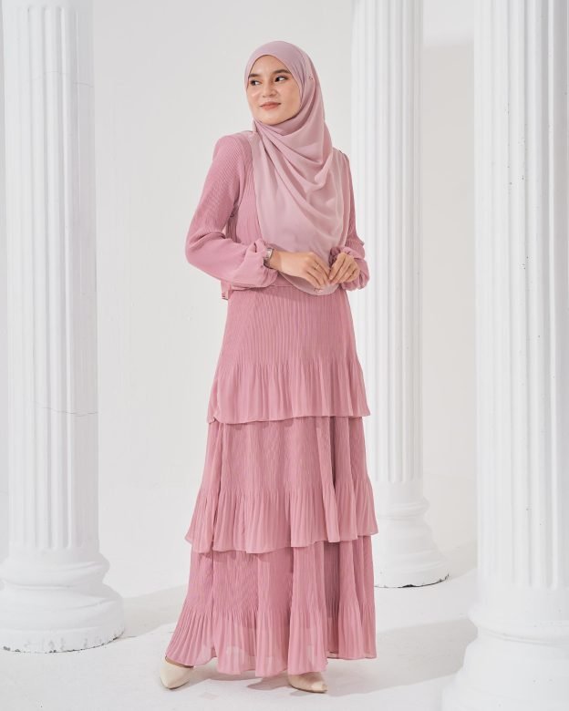 Romantic pink tones and flowing pleats create a soft, graceful look. Ideal for daytime celebrations or Eid gatherings.