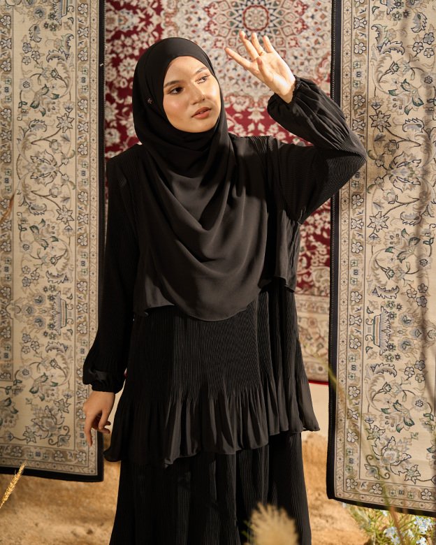 Classic black in pleated form offers timeless elegance. Ideal for both day and night occasions, from office to soirees.
