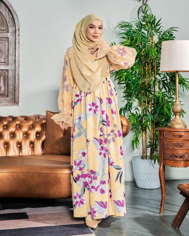Cheerful and sunny with its yellow floral print. Lightweight and flowing, perfect for summer picnics and Raya celebrations.
