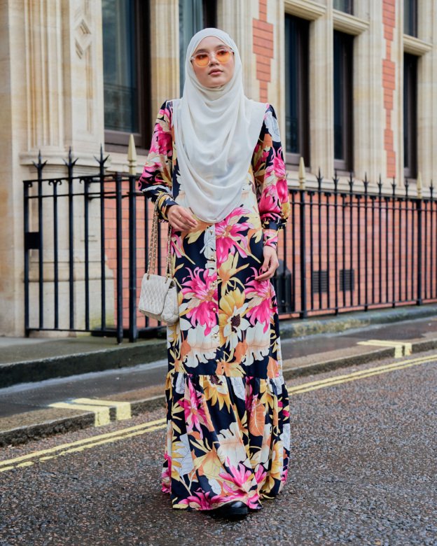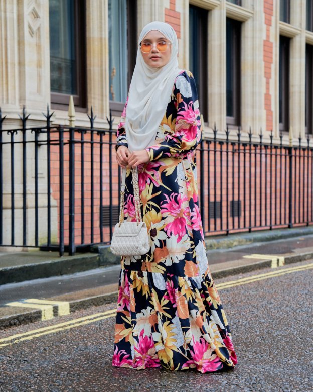 Striking floral patterns on black with ruffled accents. A dramatic yet elegant piece for dinner dates or parties.